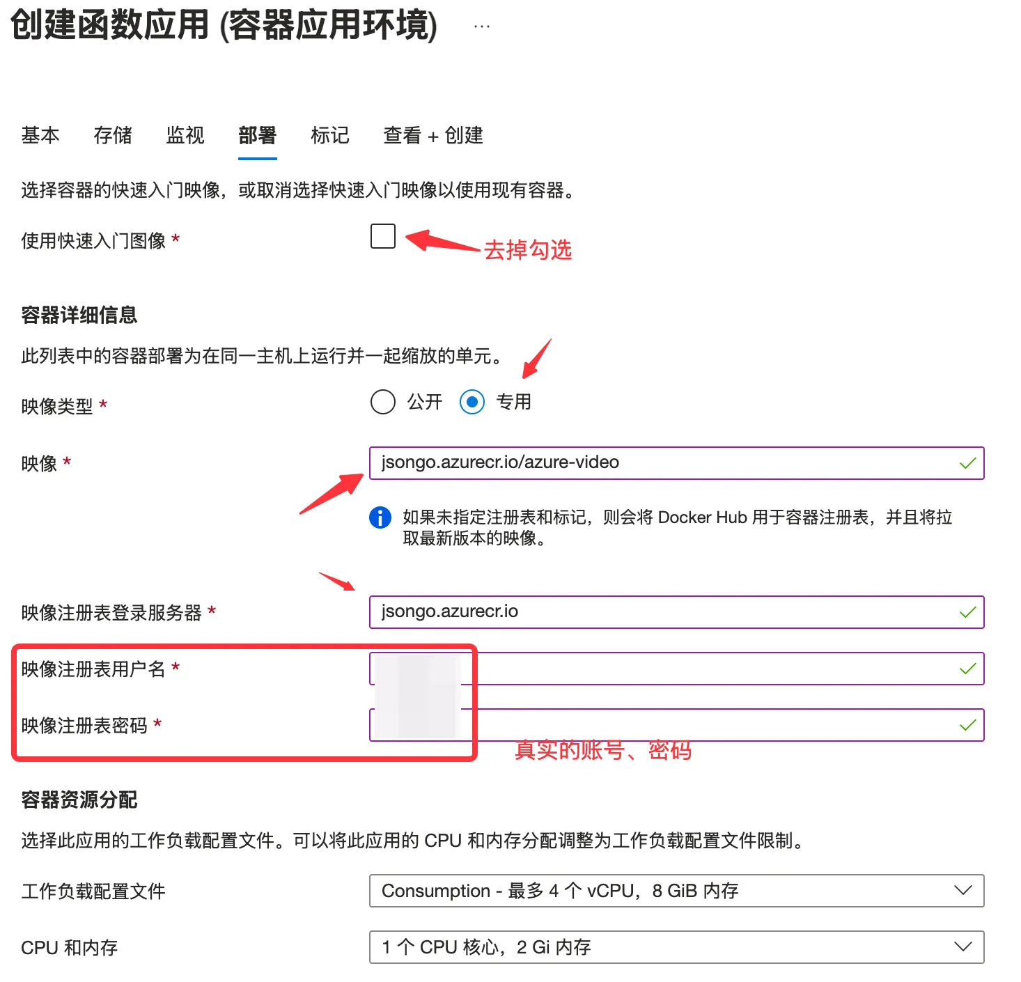 接着到“部署”选项卡中,设置你刚 push 上去的镜像。先把“使用快速入门图像”勾选去掉,另外映像类型选专用的(Private),如图一样填写你的镜像信息。
