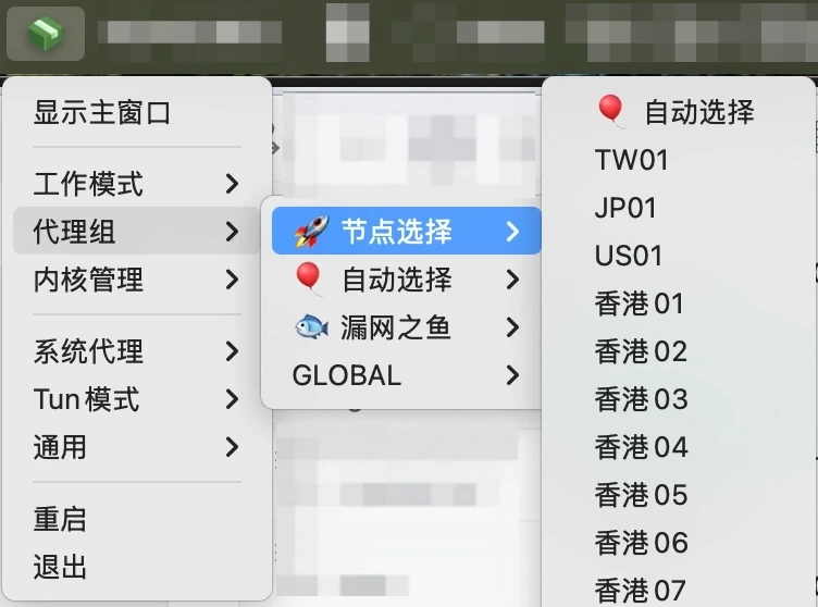 在顶部菜单上可以先把节点,其它的都跟 clashx 差不多。